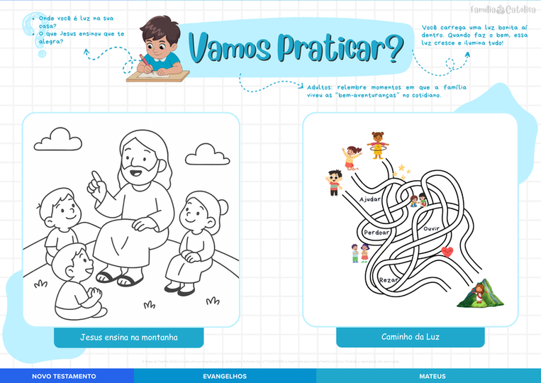 Mapas visuais, histórias infantis, atividades lúdicas e orações práticas — tudo pronto para imprimir ou usar no celular, tablet e computador